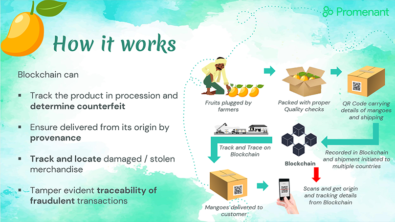 Blockchain farm-to-fork pilot is Live tested in export of mangoes from India to Singapore. The platform is to track the product in procession from “farm-to-fork” and determine counterfeit ensuring origin provenance. Underlying Blockchain provides a tamper evident system ensuring transparency curtailing counterfeits. The platform emphasizes on the need of Blockchain siting multiple advantages to both producers & end consumers.